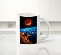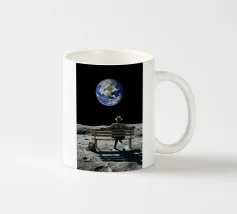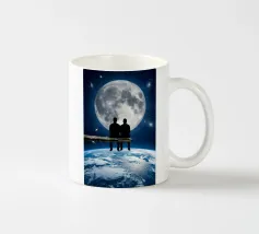 Vivevamo lì. Ricordate? Quel mondo ci sta ancora aspettando. ~ Coppia seduta su una panchina che guarda la Terra surreale retro futuristico stellato composizione romantica. versione orizzontale