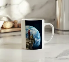 Vivevamo lì. Ricordate? Quel mondo ci sta ancora aspettando. ~ Coppia seduta su una panchina che guarda la Terra surreale retro futuristico stellato composizione romantica. versione orizzontale
