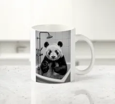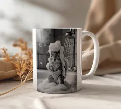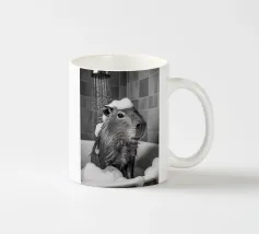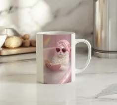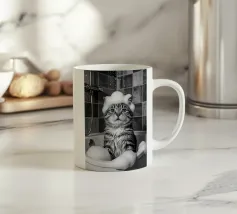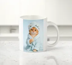 Un soffice gatto con gli occhi spalancati è seduto in una vasca da bagno piena di bolle, circondata da un bagno floreale azzurro e rosa. La scena offre un'espressione stravagante e leggermente sorpresa del gatto bagnato.
