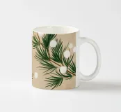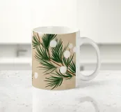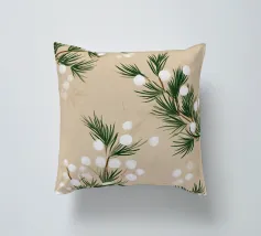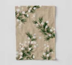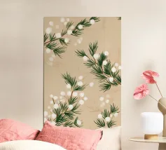 Un morbido motivo botanico dipinto a mano con rami di pino invernale e delicate bacche di neve bianche. Le calde tonalità del beige si fondono con espressivi tratti pittorici per creare un disegno stagionale sereno e naturalmente elegante. Perfetto per aggiungere un'atmosfera invernale e rilassante a qualsiasi interno moderno.
