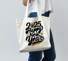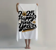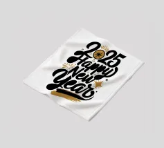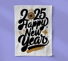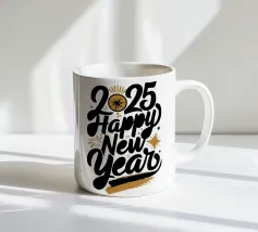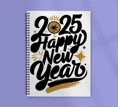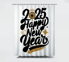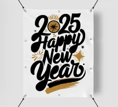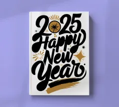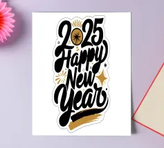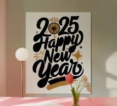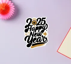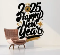 Una tipografia audace e festosa annuncia "2025 Happy New Year" con elementi decorativi come stelle e scoppi. Un accento dorato aggiunge un tocco di eleganza e di festa.