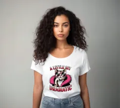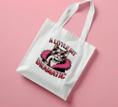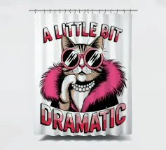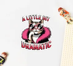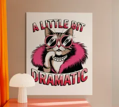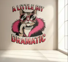 Un gatto vestito in modo glamour, con occhiali da sole oversize, una pelliccia rosa e una collana di perle, emana sicurezza. La frase "A Little Bit Dramatic" è ben visibile sul gatto.
