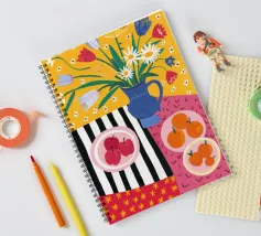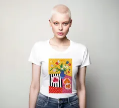Una vibrante natura morta massimalista con un colorato bouquet di fiori, un vaso a righe e una ciotola di mandarini. La composizione è una festa gioiosa, energica e colorata per gli occhi.