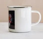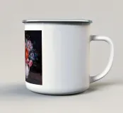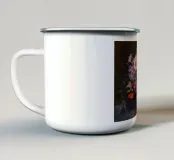 Una brocca bianca contiene un abbondante e traboccante bouquet di fiori in un tripudio di colori rosa, viola, rossi e gialli, dipinti in uno stile ricco, scuro e lunatico che sembra al tempo stesso classico ed espressivo.