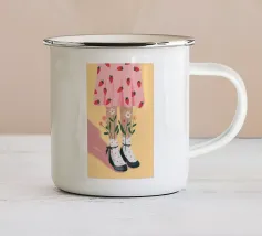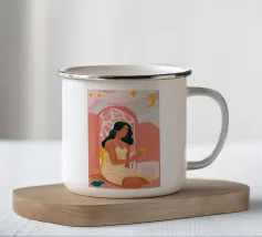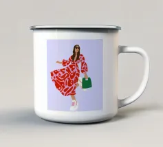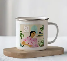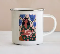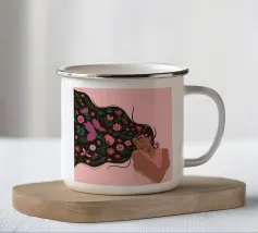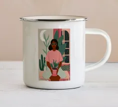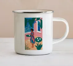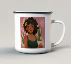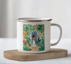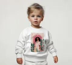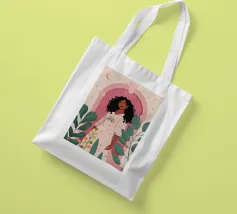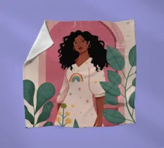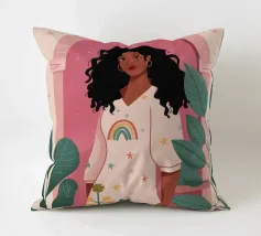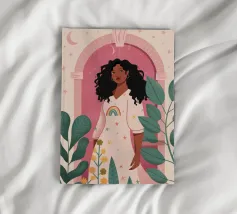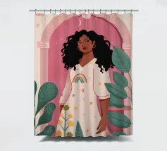 Questa opera d'arte ritrae una persona avvolta da piante verdi e rigogliose, che indossa un abito bianco con motivi arcobaleno. L'arco rosa sullo sfondo aggiunge un sereno tocco botanico.
