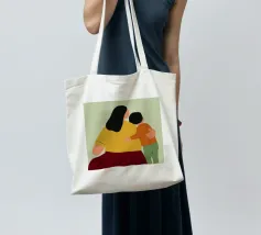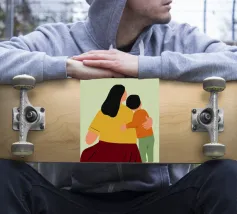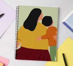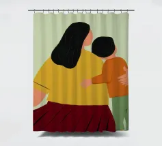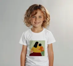 Una scena commovente di una donna con un top giallo che abbraccia da dietro un bambino piccolo, trasmettendo un potente senso di amore materno, conforto e protezione.