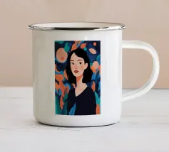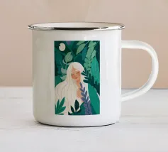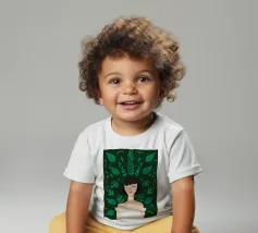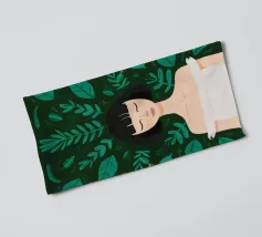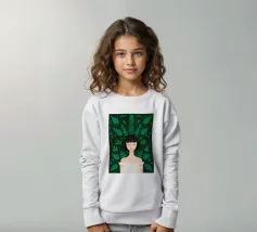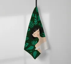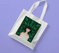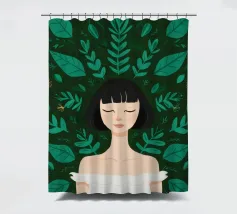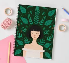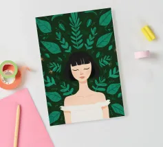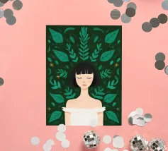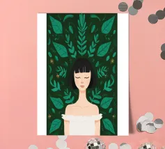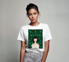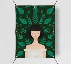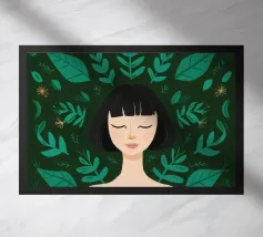 Un ritratto sereno di una donna con gli occhi chiusi, incorniciato da foglie verdi e rigogliose. La composizione è una rappresentazione pacifica, bella e intima di un legame profondo e tranquillo con il mondo naturale.