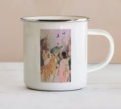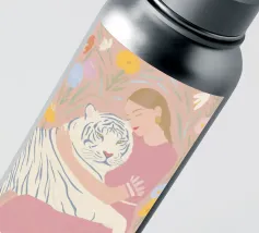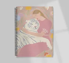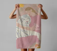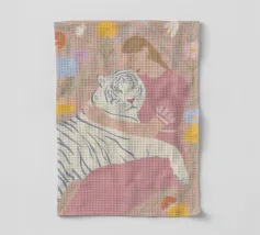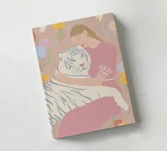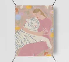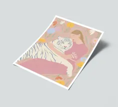 In tenui colori pastello, il ritratto mostra una giovane donna che abbraccia amorevolmente una tigre bianca, circondata da piante fiorite in giardino. Le delicate tonalità di rosa, azzurro e verde conferiscono all'illustrazione un'allegra atmosfera estiva. Quest'opera d'arte cattura il legame armonioso tra uomo e natura in una composizione incantevole.