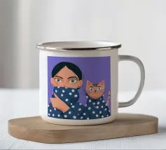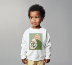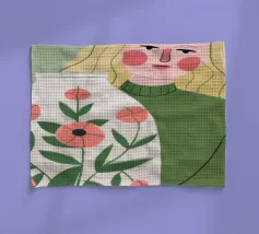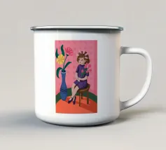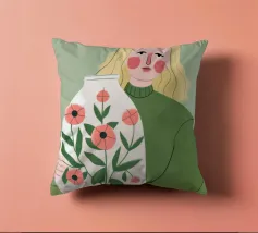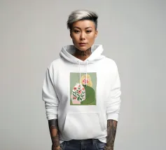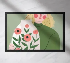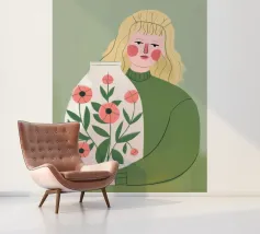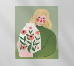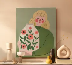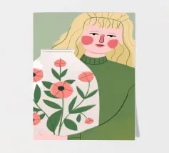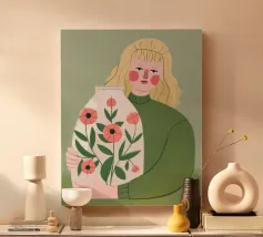 Questo dipinto mostra una persona che tiene in mano un grande vaso decorato con fiori. La persona indossa un maglione verde e lo sfondo è di un verde tenue che sottolinea il legame con la natura e la tranquillità.