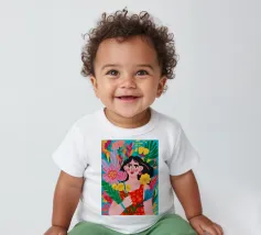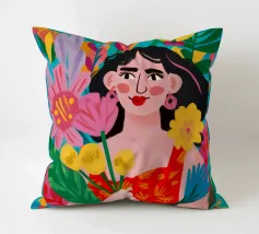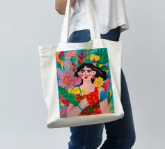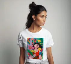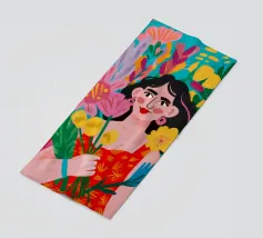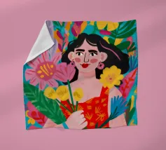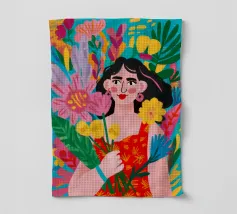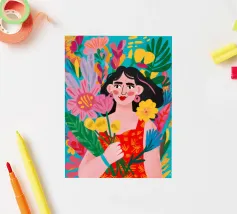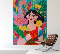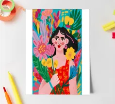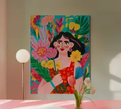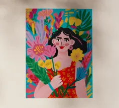 Questo dipinto raffigura una persona circondata da grandi fiori colorati, creando un senso di abbraccio con la natura. I colori vivaci e i dettagli intricati rafforzano la sensazione di connessione con il mondo naturale.