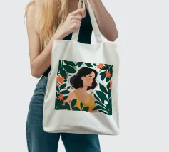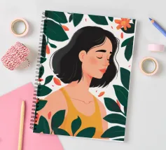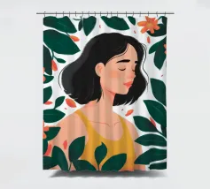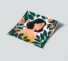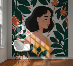 Un bellissimo ritratto di donna con capelli scuri e un semplice top giallo, circondata e abbracciata da fiori bianchi e foglie verdi. La sua espressione dolce e la cornice naturale creano un'atmosfera serena e pacifica.