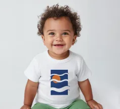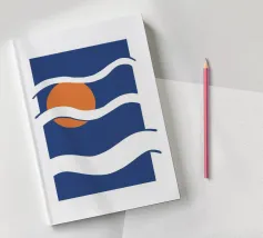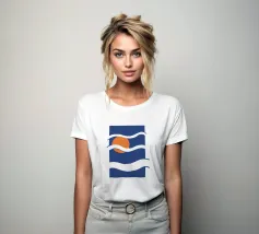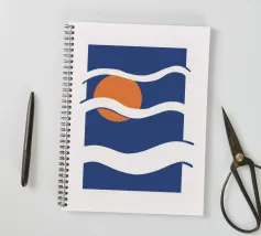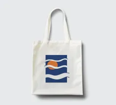 Un paesaggio marino astratto di notte, con un sole o una luna bianchi parzialmente abbracciati da onde blu intenso. Le forme semplici e decise e l'elevato contrasto creano una rappresentazione potente e grafica dell'oceano.