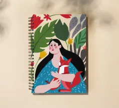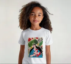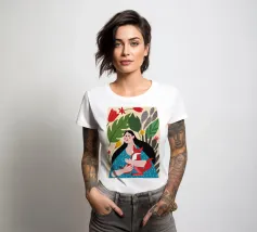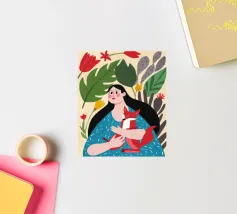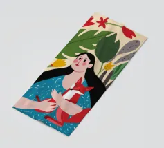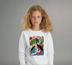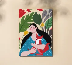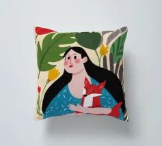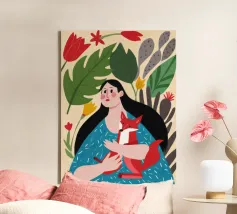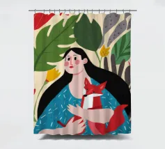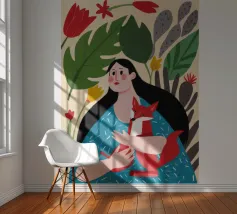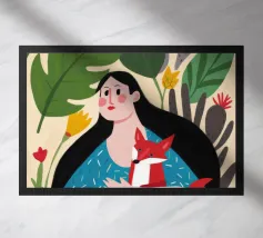 Il dipinto mostra una persona con lunghi capelli neri, che indossa un abito blu a pois bianchi e tiene in mano una volpe rossa. Lo sfondo è pieno di foglie verdi e fiori rossi.