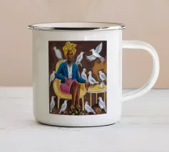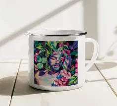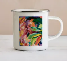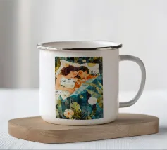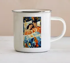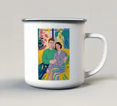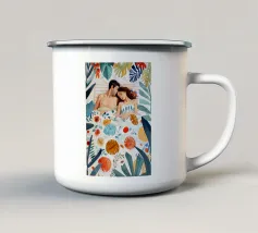 Questa opera d'arte raffigura due persone sdraiate insieme su uno sfondo colorato e tropicale. I colori vivaci e la posa intima trasmettono un senso di calore e connessione.