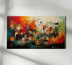Un vibrante dipinto astratto caratterizzato da audaci schizzi di colore, linee che si intersecano e forme stratificate. La composizione dinamica presenta ricche tonalità di rosso, arancione, verde acqua e nero, mescolando caos e armonia per creare un'opera di grande impatto visivo ed espressivo.