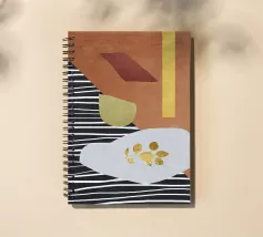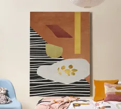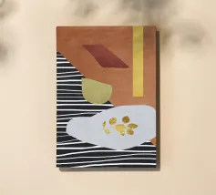 Forme e colori astratti sono disposti in una composizione di grande impatto visivo, caratterizzata da un mix di linee bianche e nere, toni terrosi e accenti dorati. Forme geometriche come rettangoli e forme organiche sono stratificate per creare profondità e contrasto.