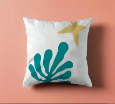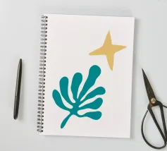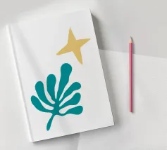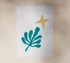 Una forma astratta di foglia verde acqua è posizionata sotto una stella gialla su sfondo bianco. Il design è semplice e moderno, con colori vivaci e linee pulite.