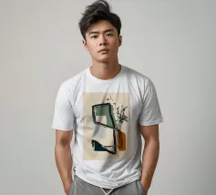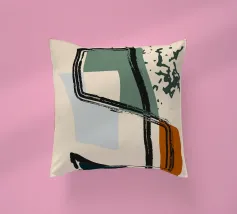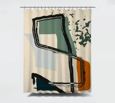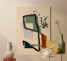 Una serie di linee nere e decise crea un motivo astratto sovrapposto a forme verdi, bianche e arancioni. Gli schizzi di vernice aggiungono un tocco dinamico e spontaneo alla composizione.