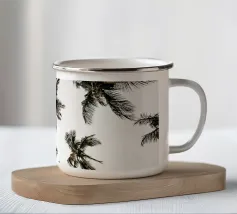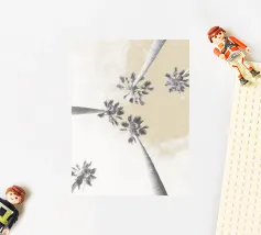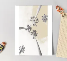 Lasciatevi trasportare dall'eleganza e dalla maestosità di queste palme imponenti. Mentre le loro cime formano un disegno circolare contro un cielo morbido e pastello, sentite la pace e la calma che offre la natura. Questa angolazione insolita non solo mette in risalto l'altezza degli alberi, ma anche la loro bellezza senza tempo.