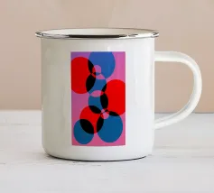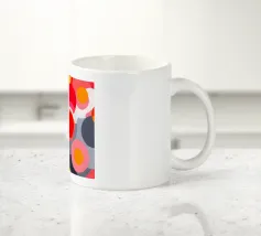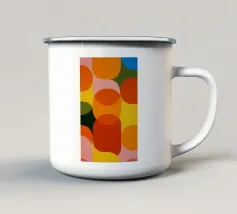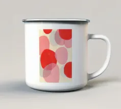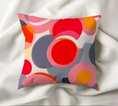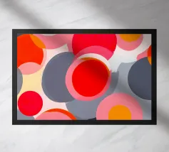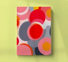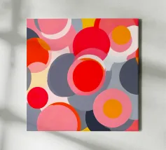 Questo dipinto astratto è una composizione vivace e densa di cerchi e ovali sovrapposti. La tavolozza dei colori è al tempo stesso contrastante e armoniosa, dominata da toni caldi come il rosso vivo, il rosa chiaro e scuro, l'arancio e il giallo, bilanciati da tonalità fredde di grigio, dal grigio chiaro all'antracite. Le forme appaiono parzialmente trasparenti, creando una profondità ottica. Lo stile pittorico è bidimensionale e ricorda la pop art o la pittura a campi di colore. La pittura irradia un'energia giocosa e moderna e la gioia del colore.