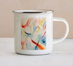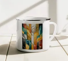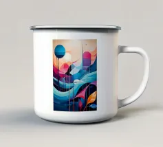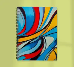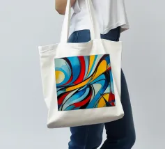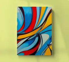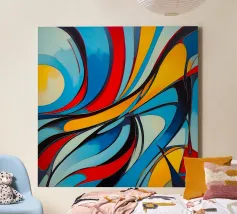 Quest'opera d'arte quadrata e astratta è caratterizzata da linee dinamiche e fluide e da forme curve che creano un effetto di aspirazione. La combinazione di colori è ricca di contrasti e vibrante, composta da colori primari: rosso forte, giallo brillante e varie tonalità di blu (dal blu chiaro al blu scuro), completati dal bianco e dal nero. Le linee di contorno nere sottolineano i segmenti curvi che attraversano la superficie come onde o nastri. Lo stile ricorda l'art déco o la pop art e trasmette un senso di movimento, velocità ed energia ritmica.
