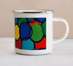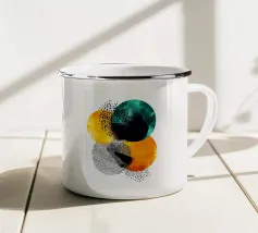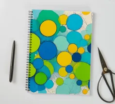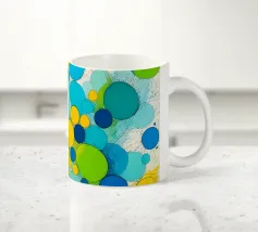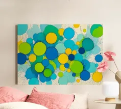 Quest'opera astratta presenta una vivace composizione di numerosi cerchi di diverse dimensioni. La tavolozza dei colori è dominata da un giallo brillante, un blu intenso e un fresco verde lime, completati da toni più chiari di turchese e ciano. I cerchi si sovrappongono parzialmente, creando una certa profondità e trasparenza. Lo sfondo è luminoso e infuso di spruzzi di colore dinamici e linee sottili e veloci che aggiungono una texture vivace ed energica. L'immagine emana un'allegria giocosa e moderna.