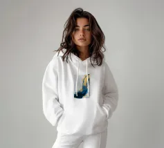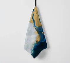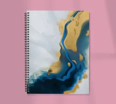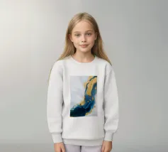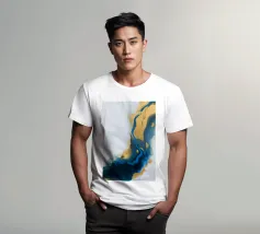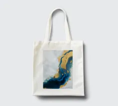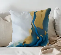 I blu e gli ori profondi dell'oceano si fondono con il bianco in una fluida fioritura di colori marini.