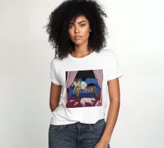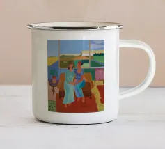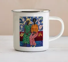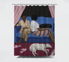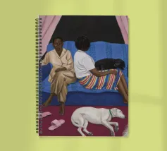 Due persone sono sedute su un divano blu, con un cane che riposa nelle vicinanze. Lo sfondo dettagliato e le loro pose rilassate creano un'atmosfera intima e accogliente.