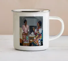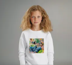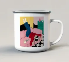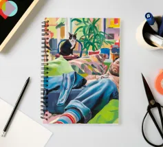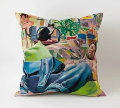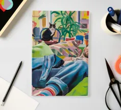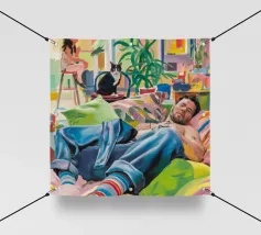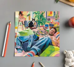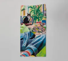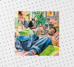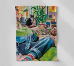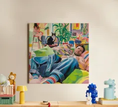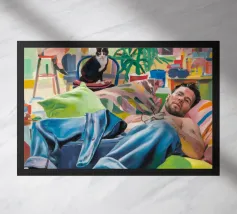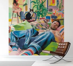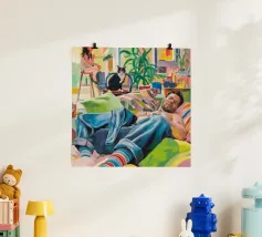 Questo dipinto mostra una persona che si rilassa in un ambiente interno colorato con piante e mobili. Lo sfondo è pieno di forme astratte e colori vivaci, che creano un'atmosfera accogliente e invitante.