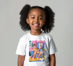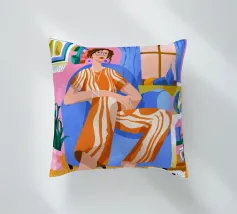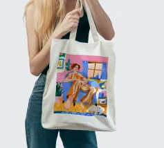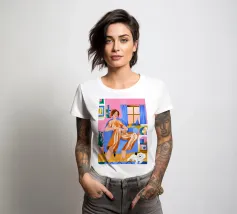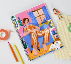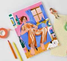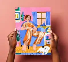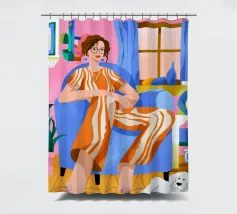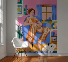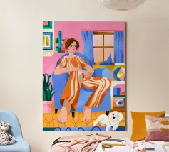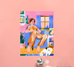 Questo dipinto raffigura una persona in pigiama a righe seduta su una sedia con una bevanda calda. Un cane bianco riposa nelle vicinanze e l'ambiente accogliente irradia calma e comfort.