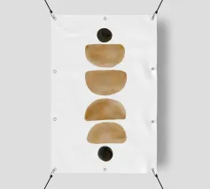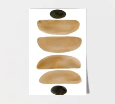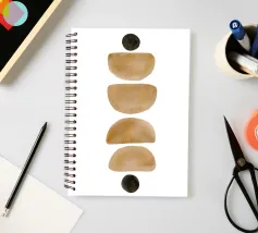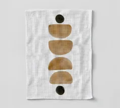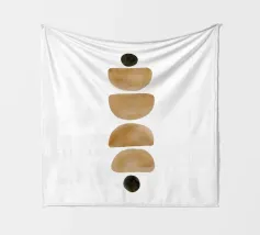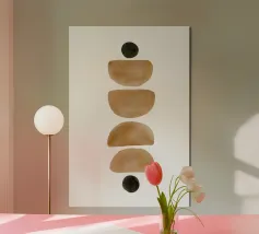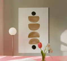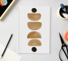 Opera d'arte minimalista ad acquerello con disposizione verticale di semicerchi e cerchi nei toni della terra su sfondo bianco.