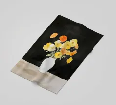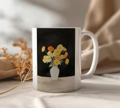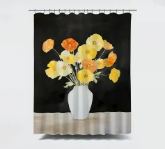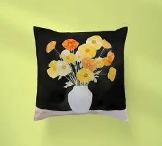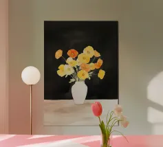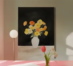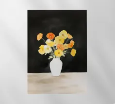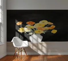 Dipinto ad acquerello di papaveri gialli e arancioni in un vaso bianco su un tavolo, su sfondo nero, in stile minimalista. Il dipinto ha una composizione semplice, con una texture di carta beige, un basso livello di dettaglio, assenza di ombre, basso contrasto, colori pastello tenui e un'illuminazione naturale morbida e bassa, che gli conferisce un'estetica da acquerello.