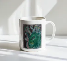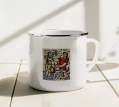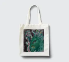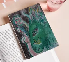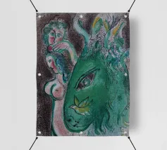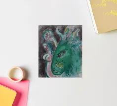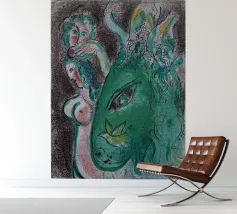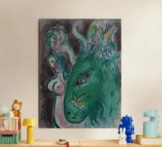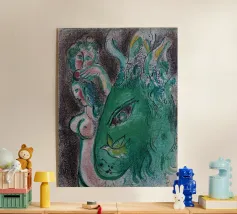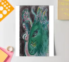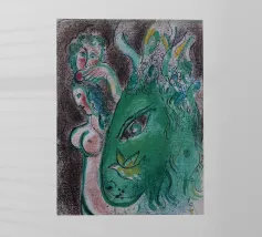 Questa litografia di Marc Chagall si ispira alle sue illustrazioni per La Bibbia, mostrando il suo caratteristico uso di colori vivaci, soprattutto il verde. L'opera cattura la scena biblica di Adamo ed Eva nel Giardino dell'Eden, con Eva spesso raffigurata vicino a una grande figura di animale mitologico. La composizione onirica e i colori ricchi celebrano i temi spirituali e la vita primitiva.