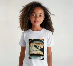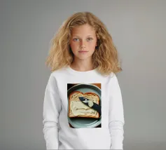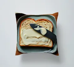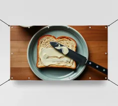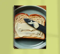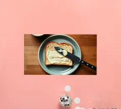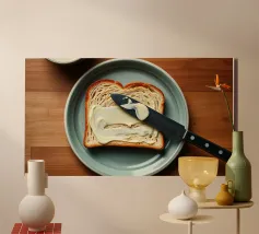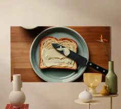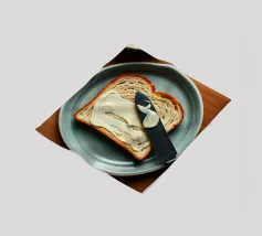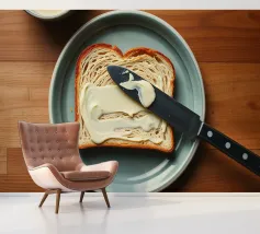 Una fetta di pane poggia su un piatto chiaro. Un coltello da burro spalma il burro cremoso sulla superficie. La calda cucina emana un'atmosfera familiare, illuminata dalla luce naturale.