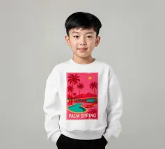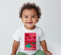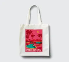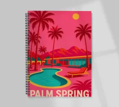 Un'esplosione di colori pop per questo poster di Palm Spring. Una piscina turchese, palme maestose e architettura di metà secolo: un must per una decorazione murale audace e solare.