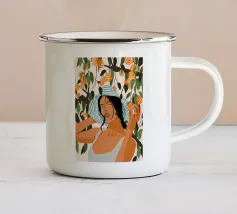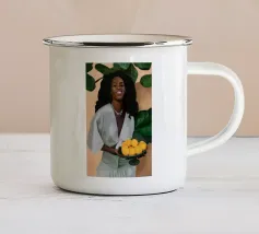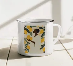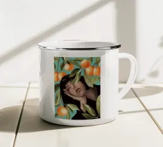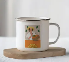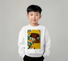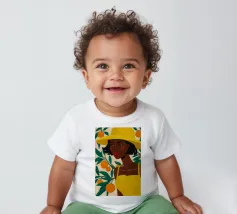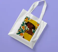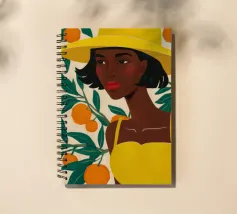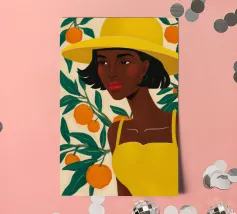 Un ritratto sorprendente di una donna di colore con un cappello da sole giallo brillante, circondata da arance. Il suo sguardo diretto e sicuro e i colori vivaci creano un'immagine potente, bella e solare.