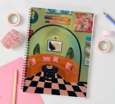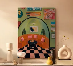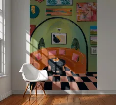 L'interno, dallo stile unico, è caratterizzato da un audace pavimento a scacchi bianchi e neri, un morbido divano circolare arancione, eleganti porte ad arco, una parete a galleria e varie piante verdi.