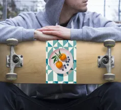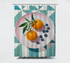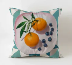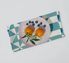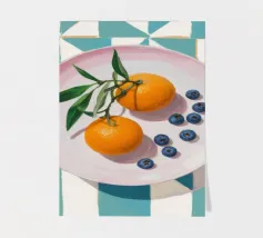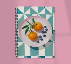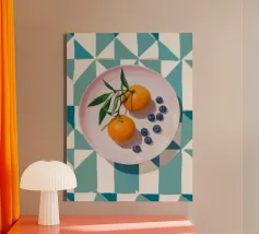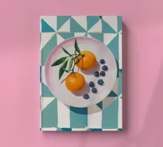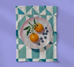 Una composizione di natura morta mostra una ciotola di arance con foglie e mirtilli su una superficie a scacchiera blu e bianca. La vista è dall'alto e crea un'esposizione grafica e appetitosa.