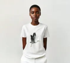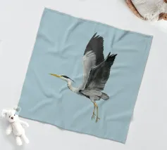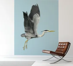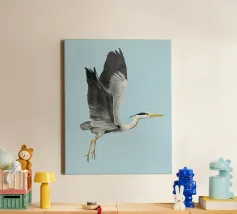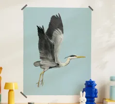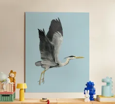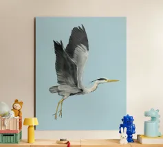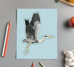 Questa immagine presenta una raffinata illustrazione di un airone cenerino (Ardea cinerea) catturato in volo. L'uccello è disegnato con un'eccezionale attenzione ai dettagli anatomici e all'eleganza. Il lungo collo forma una curva aggraziata, il becco giallo e appuntito punta in avanti con intenzione e gli occhi concentrati trasmettono un senso di movimento e determinazione.
