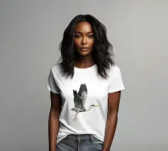 Le ali sono aperte e mostrano un'impressionante apertura alare e una posa dinamica. La struttura delle piume è intricata e dettagliata, con toni più scuri lungo la parte superiore delle ali e toni più chiari al di sotto, creando un senso di profondità e realismo. L'uso di colori morbidi e naturali