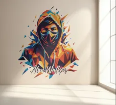 Un ritratto geometrico e colorato raffigura una persona che indossa un cappuccio e una maschera facciale su uno sfondo grigio. Il nome "Alan Walker" è scritto in basso.Alan Walker è un DJ e produttore musicale britannico-norvegese, noto soprattutto per il suo singolo di successo "Faded", che ha guadagnato popolarità in tutto il mondo. La sua musica fonde tipicamente elementi elettronici, deep house e pop, caratterizzati da ganci melodici e suoni atmosferici. Walker è noto anche per il suo logo distintivo e per l'abbigliamento con cappuccio e maschera, che è diventato il suo look caratteristico.