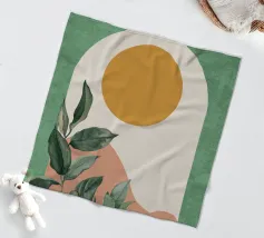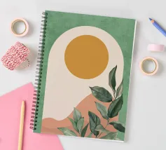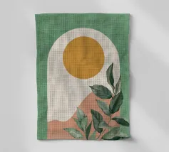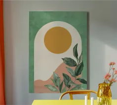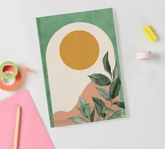 Un'opera d'arte sognante di ispirazione boho con un elegante arco che incornicia montagne mistiche, fogliame estetico e una luna luminosa. I toni della terra e le forme organiche creano un'atmosfera rilassante e libera.