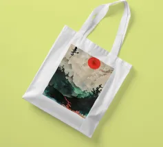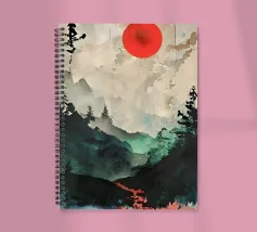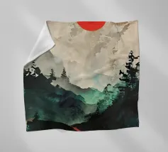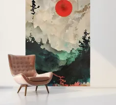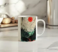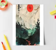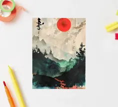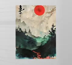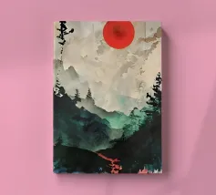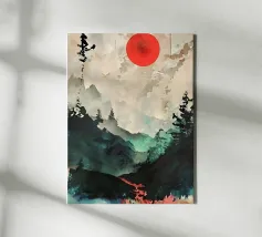 Un sereno paesaggio dipinto con una torreggiante catena montuosa immersa nel tenue bagliore di una luna cremisi. L'opera evoca un senso di tranquillità e mistero, con pennellate delicate che catturano le sottili sfumature del mondo naturale.