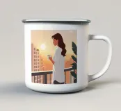 Una serena scena minimalista di una donna in piedi sul suo balcone, con in mano una bevanda calda mentre il sole sorge sulla città. Questa opera d'arte celebra la consapevolezza, la gratitudine e la tranquilla bellezza dei nuovi inizi.