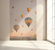 Mongolfiere all'alba in Cappadocia in un cielo dai colori pastello.