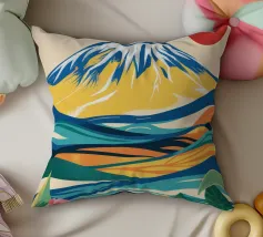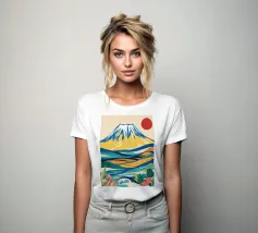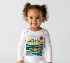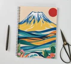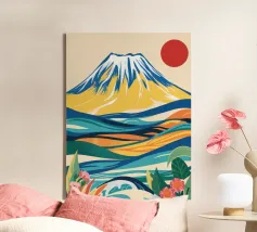 Una maestosa illustrazione del Monte Fuji in Giappone, con la sua cima innevata che brilla sotto un sole rosso nascente, con onde e nuvole stilizzate in primo piano.