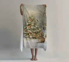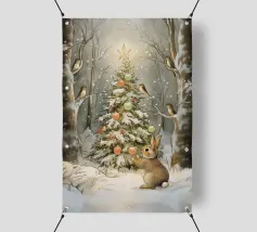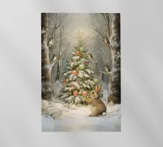 Un albero di Natale innevato e addobbato con ornamenti, stella luminosa e circondato da uccelli e un coniglio, in una serena foresta invernale.