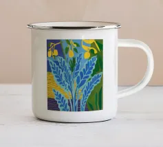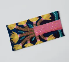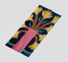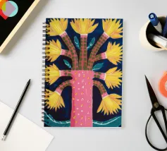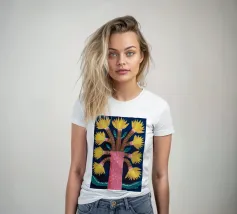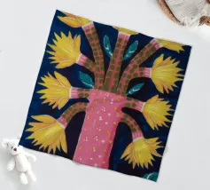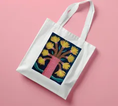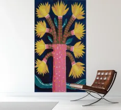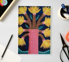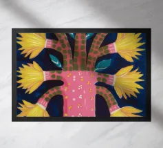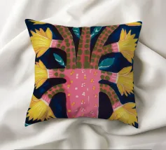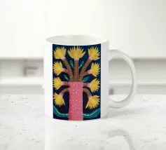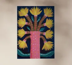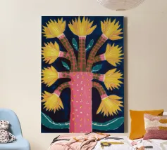 Una natura morta stilizzata con un albero dai fiori gialli e dal tronco blu, in un moderno vaso a fantasia rosa. La composizione è un'opera d'arte floreale contemporanea audace, grafica e fantasiosa.