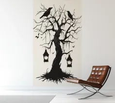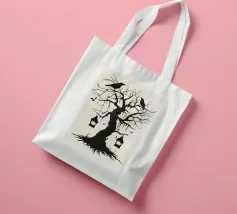 Questa silhouette mostra un albero nodoso e consumato dalle intemperie, con fili di muschio pendenti su cui sono appollaiati diversi corvi. Due lanterne pendono dai rami, mentre i pipistrelli volano sullo sfondo. Il disegno trasmette un'atmosfera misteriosa e un po' cupa che ricorda vecchie leggende o mondi fantastici. Ideale per gli appassionati di stile gotico, estetica fiabesca o decorazioni di Halloween. Il contrasto minimalista tra il nero e lo sfondo chiaro aumenta l'effetto drammatico.