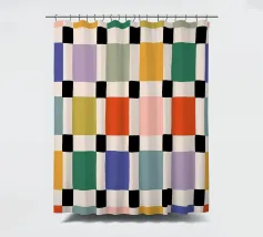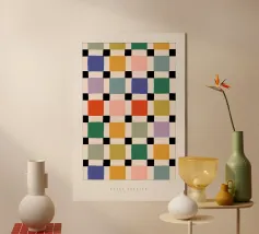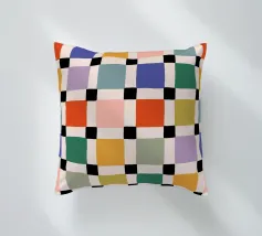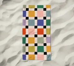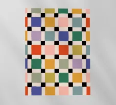 Motivo a quadri colorati con una griglia di quadrati luminosi nei toni dell'arancione, del blu, del verde, del viola e del giallo. Ogni quadrato è delimitato da linee nere irregolari che creano un disegno giocoso e artistico. Lo sfondo è di un morbido colore bianco sporco, che conferisce al motivo un aspetto moderno e allegro. Questo disegno è ideale per l'utilizzo in tessuti, carte da parati o sfondi digitali, aggiungendo un tocco di audacia e creatività.
